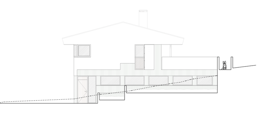 La relación de dicha construcción de chapa con el entorno es dominante, al erigirse sobre un “plinto” de hormigón compuesto por una losa de 18 m x 12,50 m, apoyada sobre una retícula de pilares de hormigón y un muro de contención hacia su cara este, que la elevan del terreno y la presentan sobre un plano horizontal en un entorno totalmente inclinado. En este entramado de pilares se ubica la planta inferior de la vivienda, el semisótano, utilizado como almacenaje, garaje y cuarto de instalaciones, abierto al oeste.