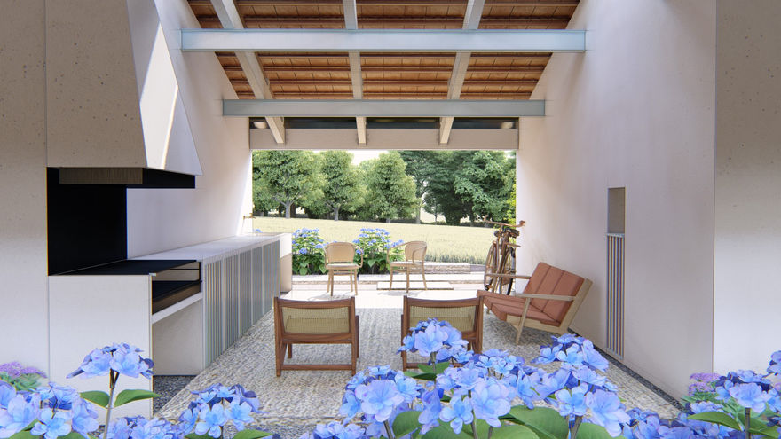 El patio pasante actúa también como una especie de recibidor exterior para las visitas, que no necesariamente han de cruzar por el interior de la vivienda, sino que pueden recibirse en este lugar y conducirse a continuación hacia el jardín. En sí, se constituye como un espacio exterior amigable que puede usarse de muchas maneras, con el fondo visual de la finca como paisaje, y una pequeña chimenea exterior que facilita su uso en el clima de Asturias.